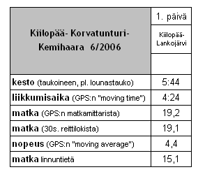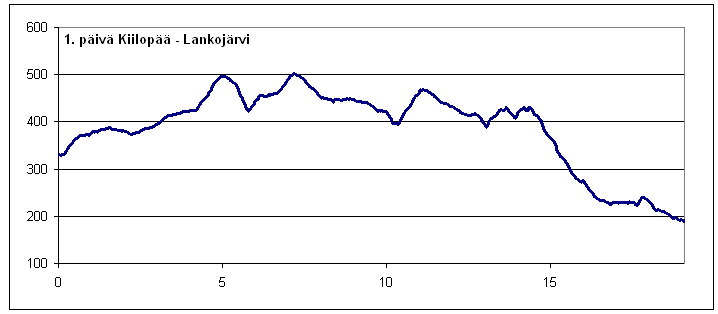 Juhannusaatona mentiin bussilla Rovaniemeltä vaelluksen aloituspaikkaan Kiilopäälle. Rinkat vaa'alle ennen lähtöä, lukemat 20 + 23,5 kg. Reitti kulki aluksi polkua ja sitten helppokulkuisia tunturiylänköjä pitkin Lankojärvelle. Ennakkoluulottomasti rinkan painoa kauhistelematta lähdettiin taittamaan "15 kilometrin" matkaa, joka yllättäen jatkuikin vielä 15 kilsan jälkeen... "Viimeiset kolme kilometriä on aina pitkät niin..."