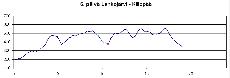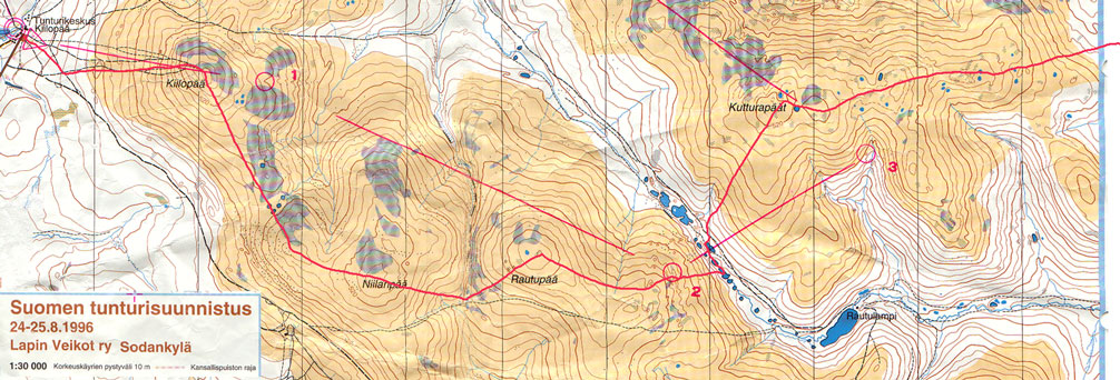 Viimeinen päivä vei Lankojärveltä Kiilopäälle Kutturapäiden kautta. Tänään päästiin hieman harjoittelemaan tulevaan Tunturisuunnistusta varten, kun ennen Kutturapäitä rinkasta kaivettiin vuoden 1996 Tunturisuunnistuksen 1:30000 kartta ja yritettiin totutella ko. kartan käyräkuvaukseen.